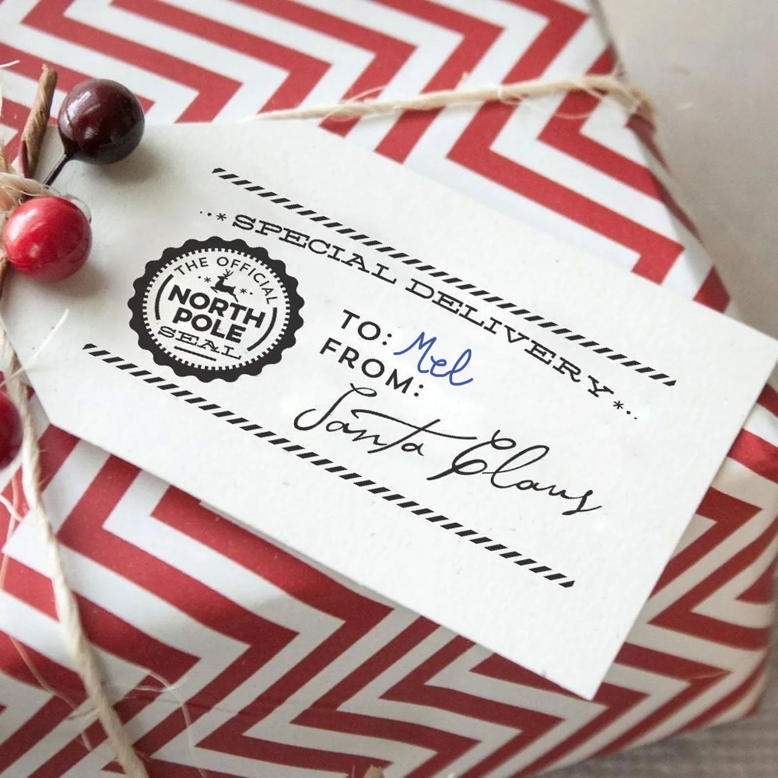 Be sure that Santa's signature looks the same year after year with this holiday gift tag stamp for all of your children's presents. Not only will you have a real Santa signature, you'll also have the North Pole seal on every gift. Use this holiday stamp year after year for all their presents from the north pole.