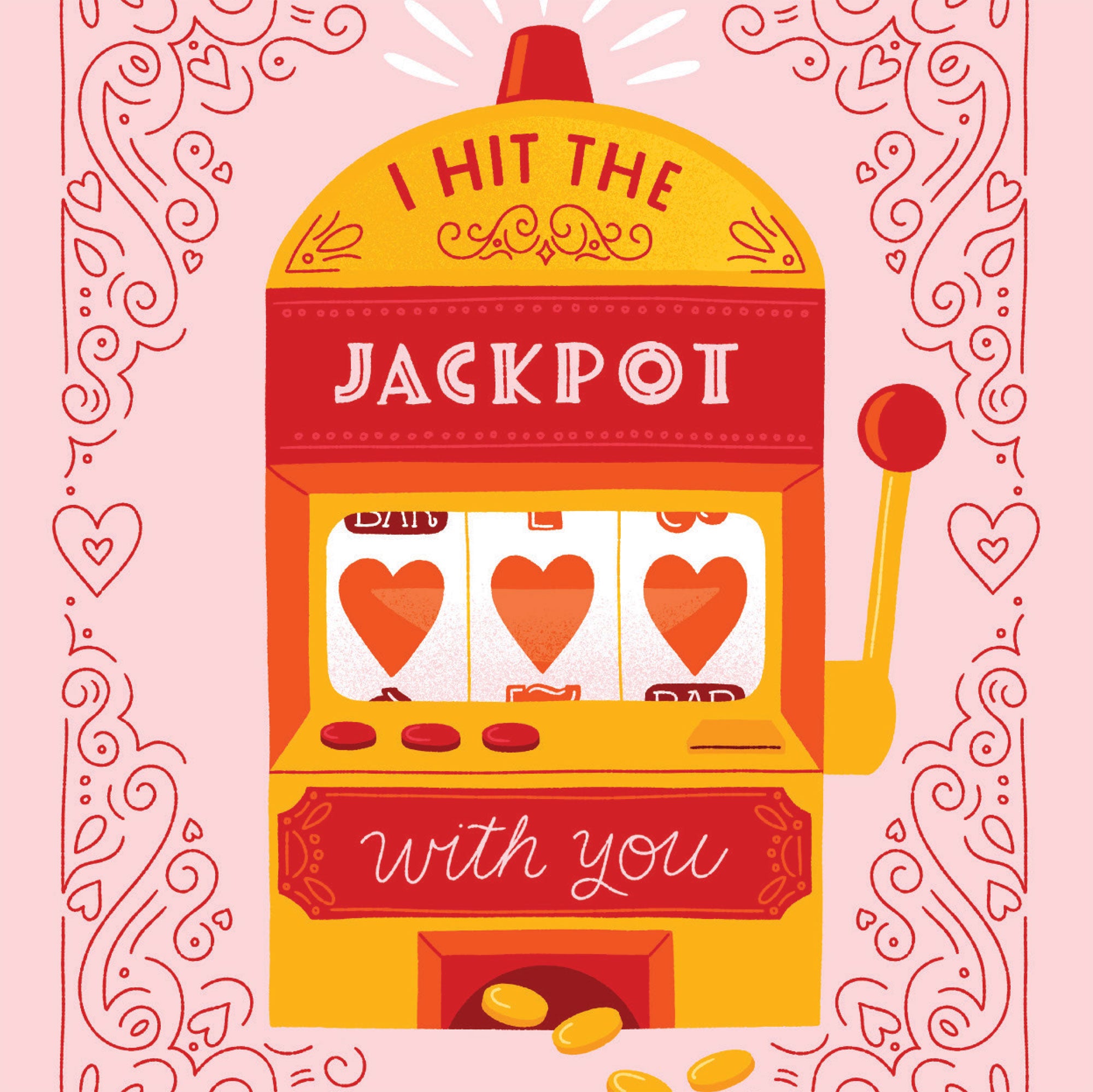 Featuring a whimsical slot machine illustration and the message “I hit the jackpot with you,” this card is perfect for Valentine’s Day, anniversaries, or just reminding your favorite person how lucky you feel. Bright reds, warm yellows, and sweet hearts make it a winning choice.